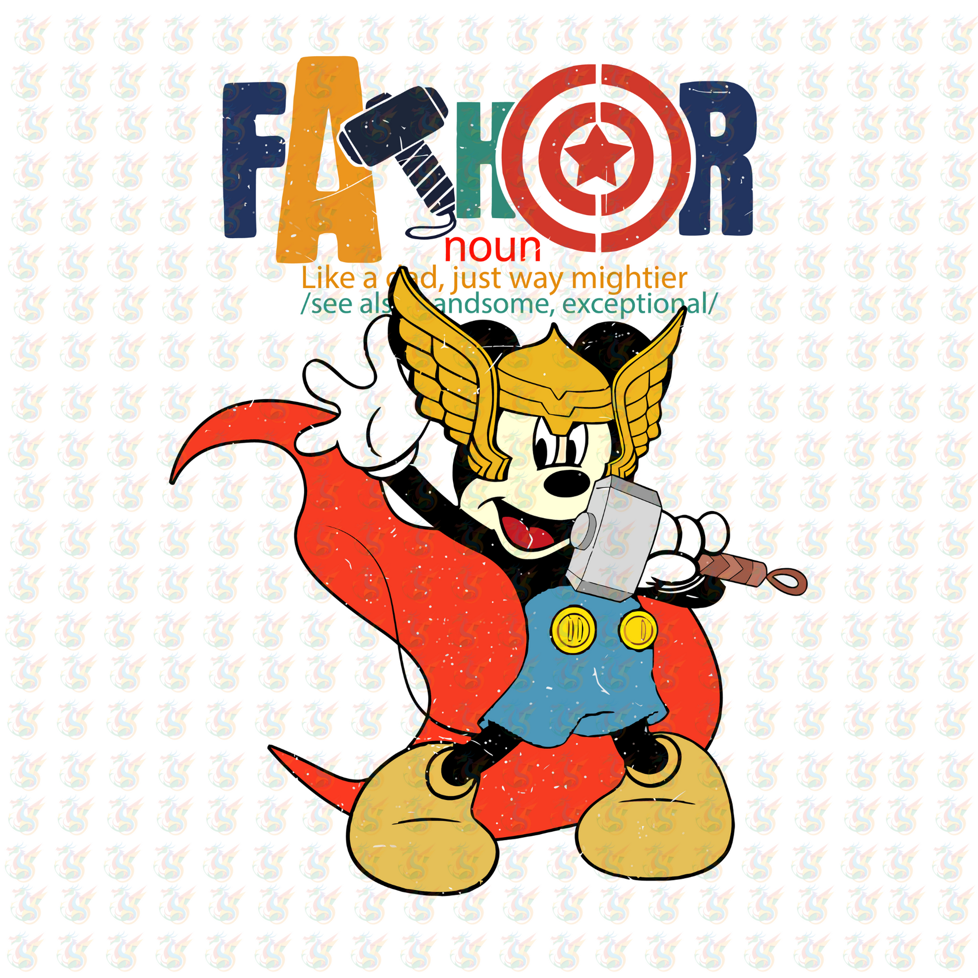 Celebrate dad's superhero status with this fun “Fathor” Ready to Press DTF transfer featuring Mickey Mouse dressed as Thor with Captain America details. The definition reads: “Like a dad, just way mightier.” Perfect for Disney and Marvel-loving dads on Father’s Day or any occasion. Easy to apply on cotton or polyester with bold, lasting colors.