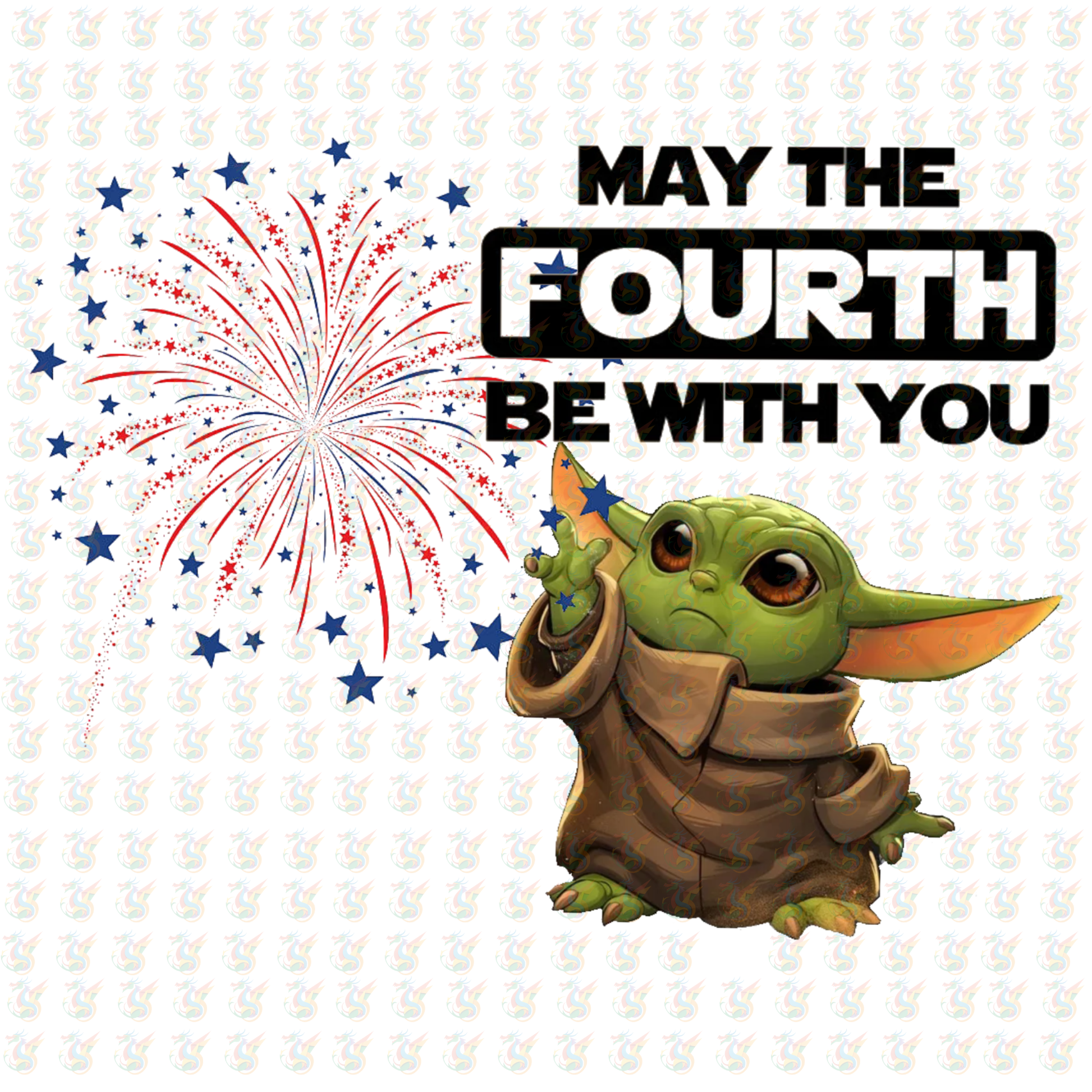 Celebrate Star Wars Day in style with this “May the Fourth Be With You” Ready to Press DTF transfer! Featuring a cute Baby Yoda (Grogu) surrounded by red, white, and blue fireworks and stars, this design brings a fun patriotic twist to your galaxy-loving outfits. Perfect for Star Wars fans, themed events, or unique holiday shirts. Easy to apply and vibrant on cotton or polyester garments—bring the Force to your next creation!
