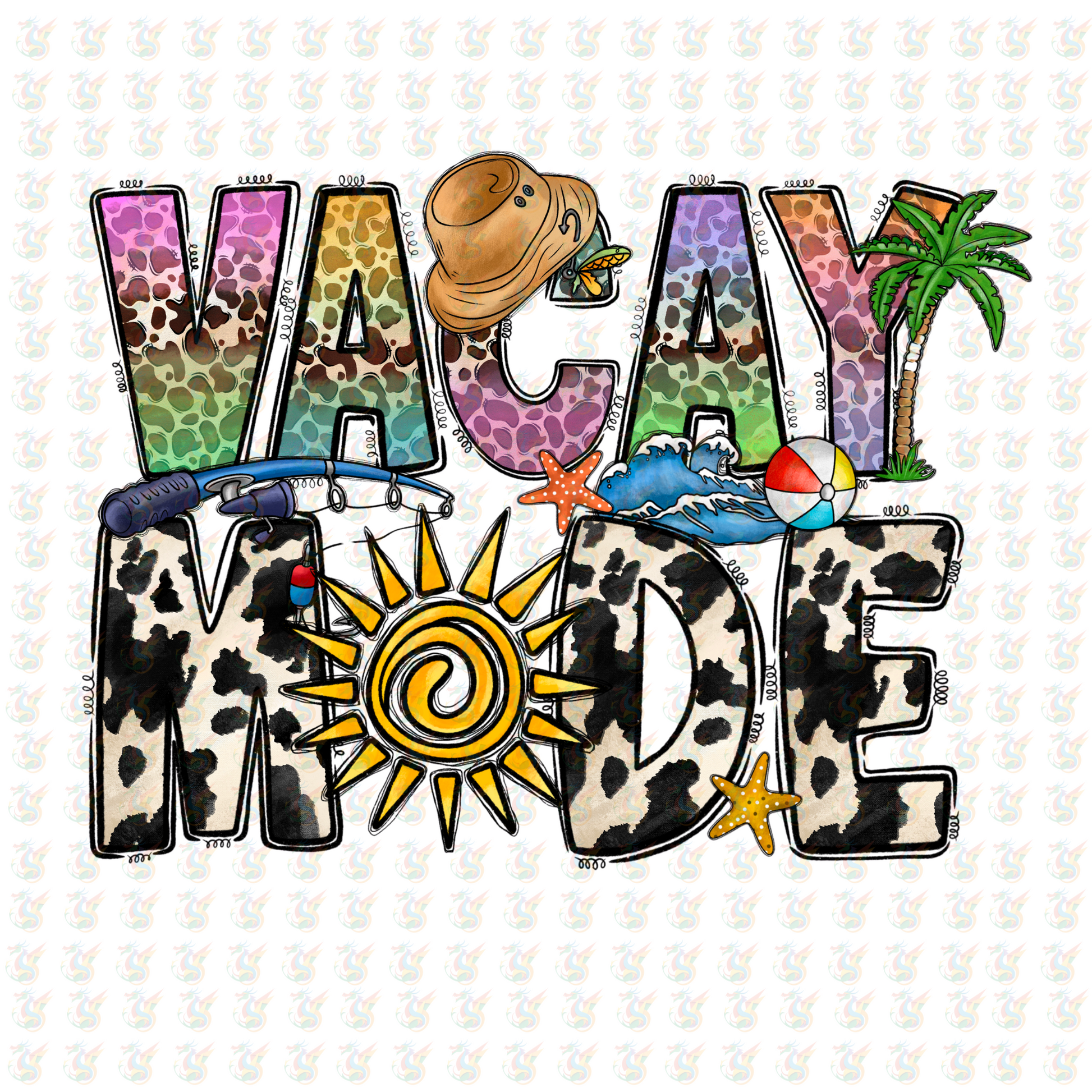 Turn on vacation vibes with this bold “Vacay Mode” Ready to Press DTF transfer featuring a mix of western cow print, tropical elements, beach gear, and rainbow leopard print. Perfect for custom vacation shirts, summer getaways, or fun family trip outfits. Easy to press on cotton or polyester garments, this vibrant design brings sunshine, sea, and style all in one.