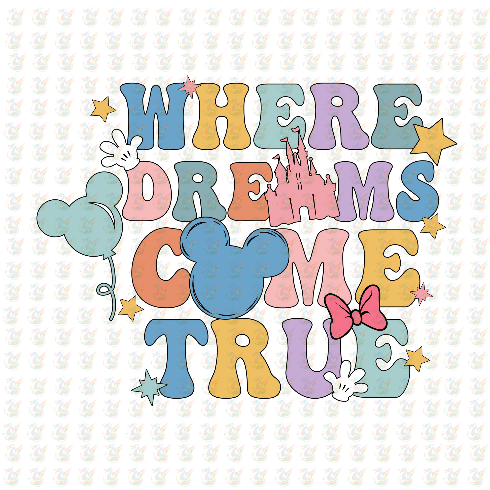 Bring the magic to life with this “Where Dreams Come True” Ready to Press DTF transfer featuring colorful retro-style letters, Mickey ears, castle silhouette, and whimsical elements like bows, stars, and gloves. Perfect for family Disney trips, vacation shirts, or dream-themed apparel. High-quality, full-color design that’s easy to apply to any cotton or polyester garment.